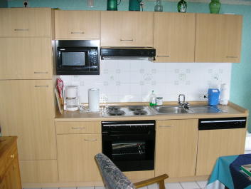 Im Wohnraum befindet sich eine voll ausgestattete Küche. Ein Ostfriesensofa und passende Sessel sorgen im Deichstübchen für Gemütlichkeit. Die zwei Fenster im Wohn- und Elternschlafzimmer sorgen für viel Helligkeit in der Wohnung und bieten einen Panoramablick auf unsere Felder und den Deich.