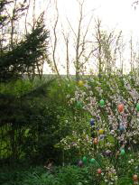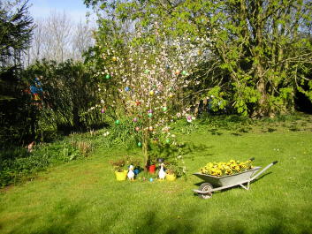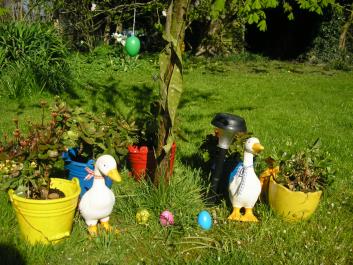 In unserem parkähnlichen Garten blühen Apfel-, Kirsch-, und Mandelblaum. Verschiedene Blumen sprießen.